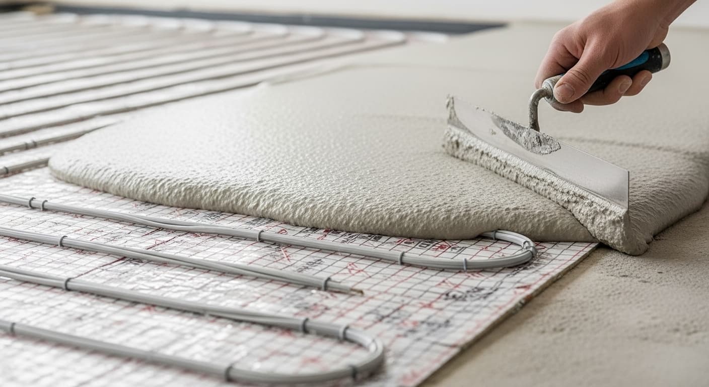 Fließfähige Ausgleichsmasse wird eingebracht und schließt die Rohre vollständig ein. Trocknungszeit 1–3 Tage, dann ist der Bodenbelag möglich.