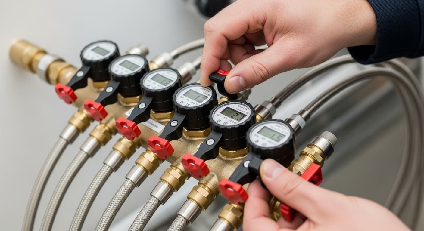 Die Regulierventile (Drehkappen) steuern, wie viel Wasser durch jeden Heizkreis fließt. Ohne Abgleich bekommen längere Kreise zu wenig, kürzere zu viel Durchfluss.
