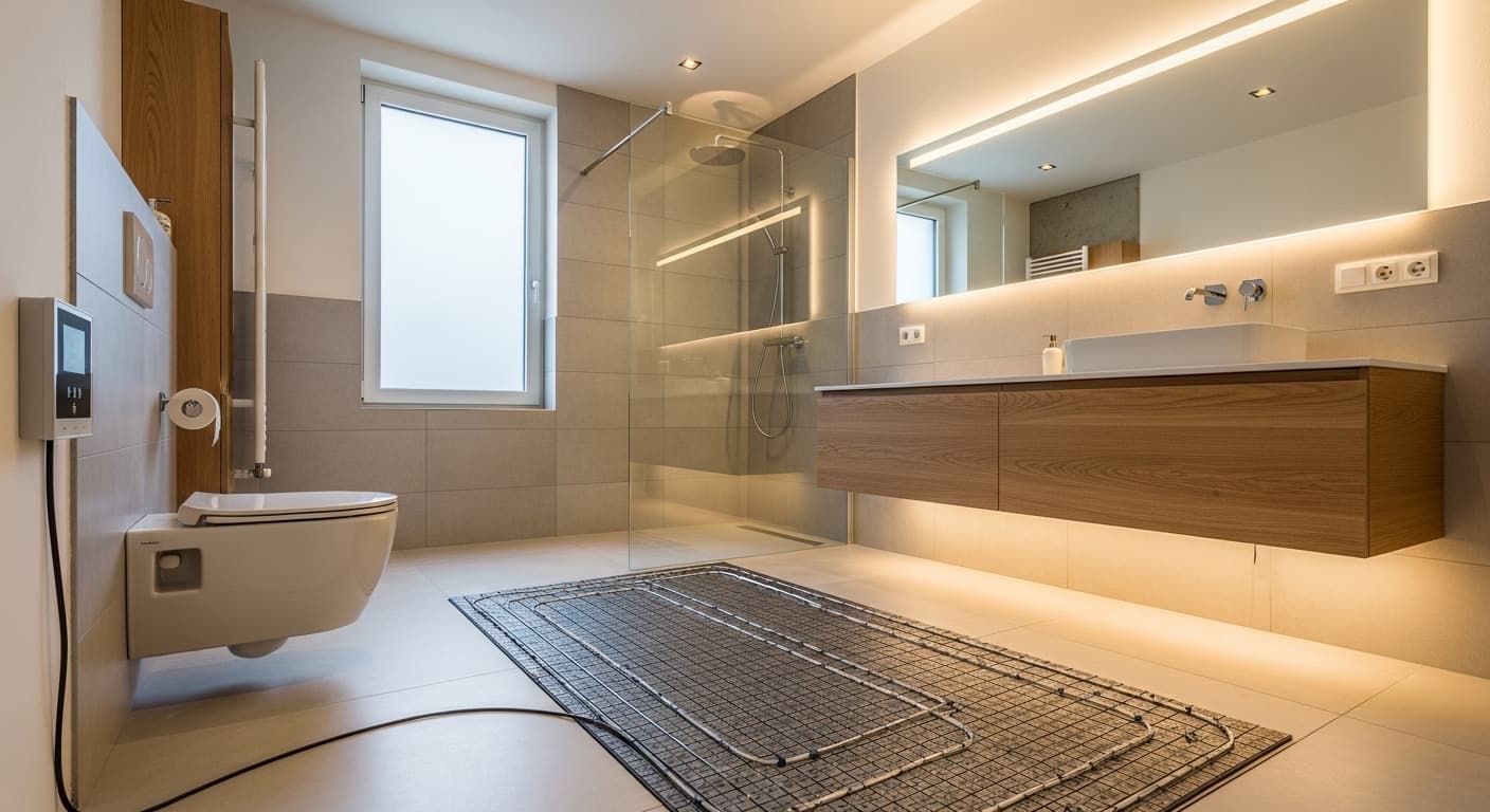 Warme Fliesen statt kalter Füße. Das Bad ist der häufigste Einsatzort für elektrische Fußbodenheizungen: kleine Fläche, hoher Komfortgewinn, einfache Nachrüstung unter Fliesen.