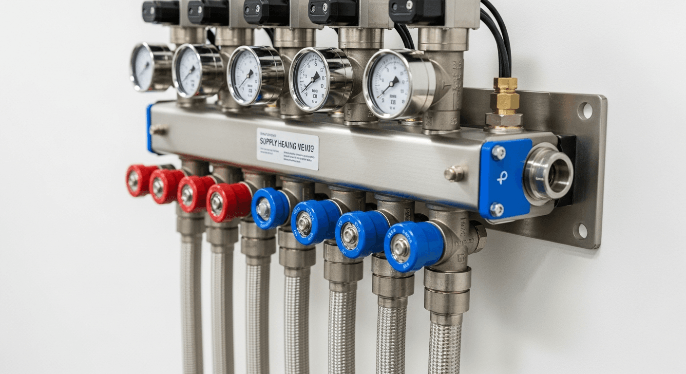 Ein Heizkreisverteiler besteht aus mehreren Komponenten, die zusammen dafür sorgen, dass jeder Raum mit der richtigen Wassermenge und Temperatur versorgt wird.