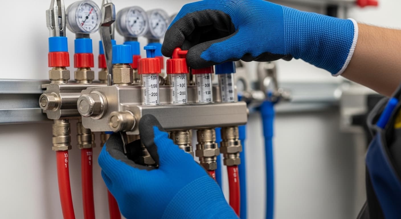 Einstellung der Durchflussmengen an den Heizkreisverteilern gemäß Berechnung. Abgleich mit dem tatsächlichen Volumenstrom.