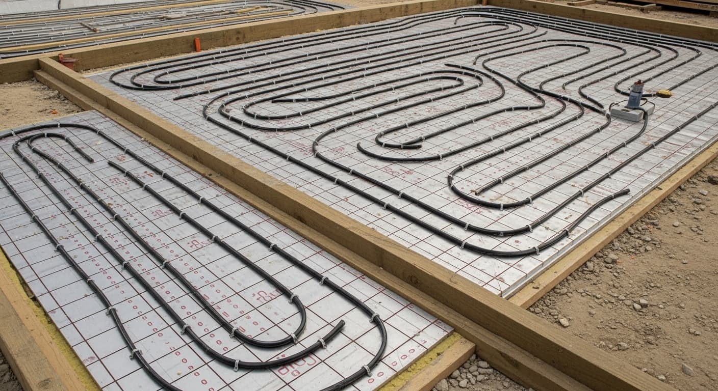 Gipsfaserplatten erreichen nur 0,04 m²K/W bei 25 mm Dicke. Der Grenzwert nach DIN EN 1264 liegt bei 0,15 m²K/W. Aluminium-Wärmeleitbleche verteilen die Wärme auf 15 bis 20 cm Breite.